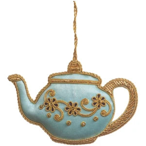 A handmade and ethically sourced fabric decoration featuring a beautiful blue satin teapot. Pair with our lovely teacup decoration and complete your tea set!. This hanging ornament has been skilfully sewn by hand, supporting Fair Trade workers.