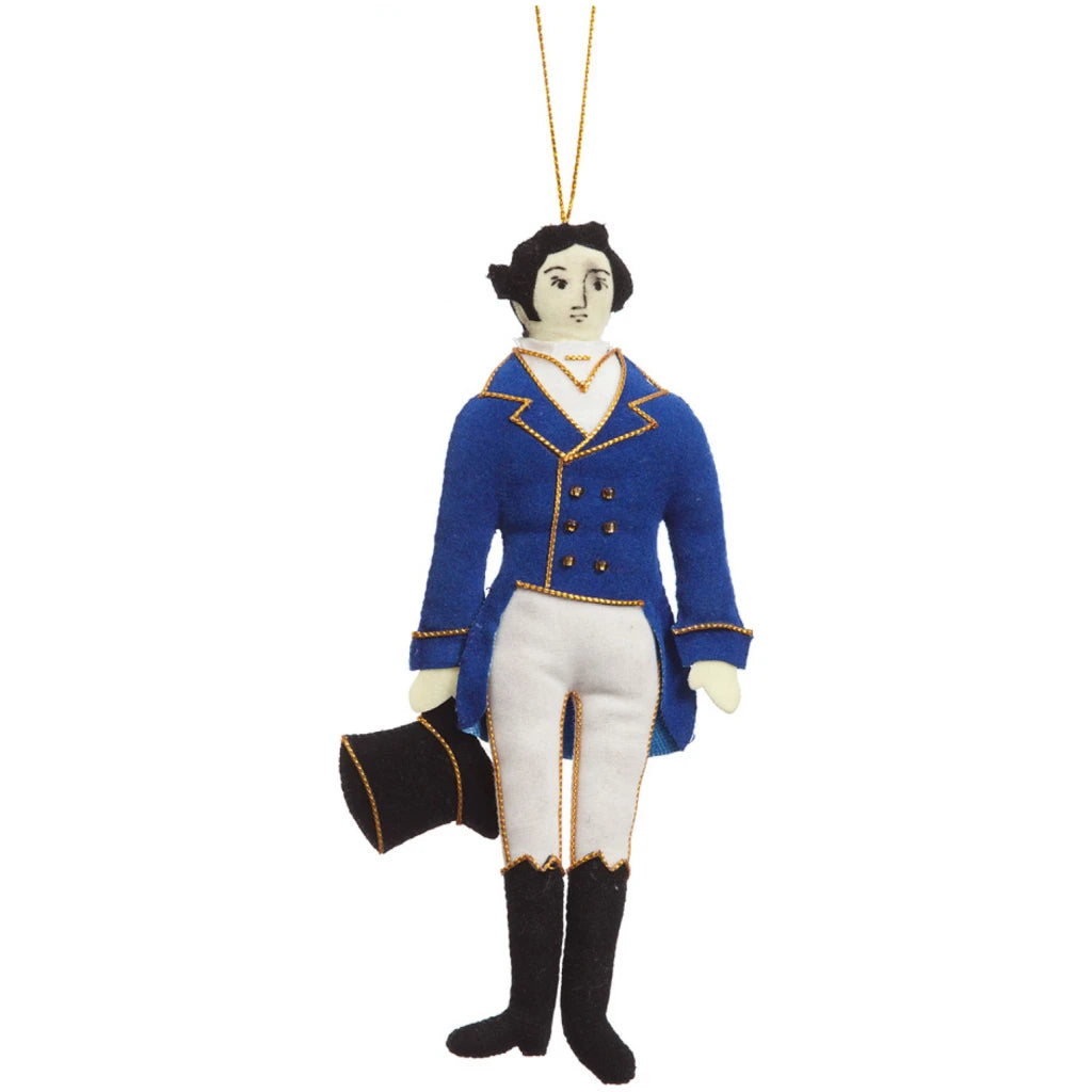 A handmade and ethically sourced fabric decoration featuring Mr Darcy, from Jane Austen's Pride and Prejudice. This hanging ornament has been skilfully sewn by hand, supporting Fair Trade workers.